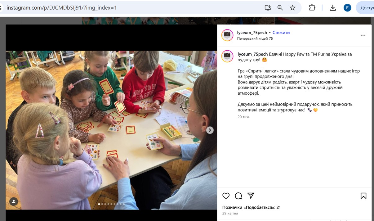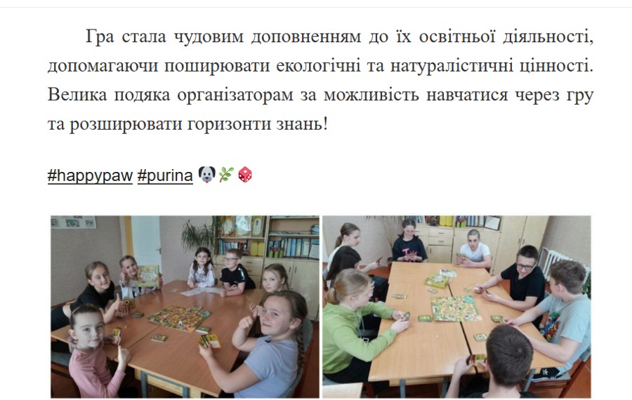 Також найактивніші учасники отримали від нашого Фонду та ТМ "Purina" один з подарунків: настільну гру "Happy paw", набір пазлів "Домашні улюбленці", карткову гру "Спритні лапки" або настільну гру "Знайди господаря".
