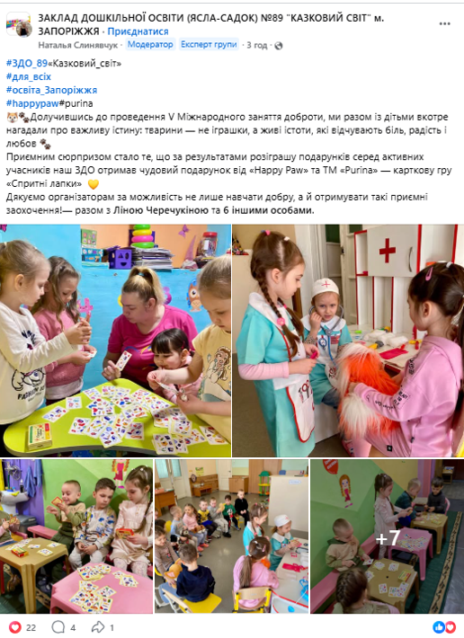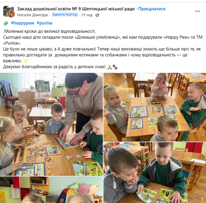 Серед навчальних закладів, які долучились до V Міжнародного заняття доброти, ми провели розіграш 300 подарунків у вигляді наборів пазлів "Домашні улюбленці" та комплектів карткової гри "Спритні лапки" від нашого Фонду та наших партнерів ТМ "Purina".